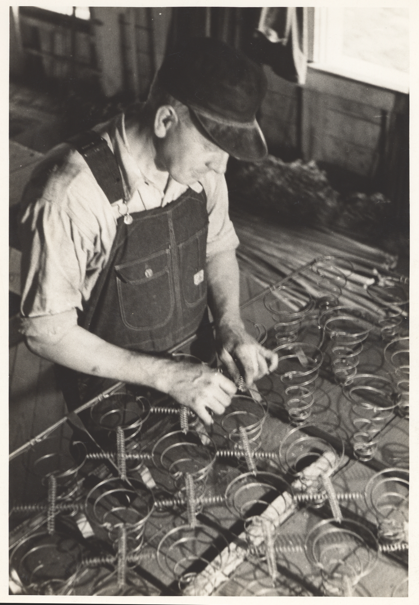Well known for its "unbreakable" all-iron box springs, the company creates a combination wood/steel design to reduce steel usage during World War II.