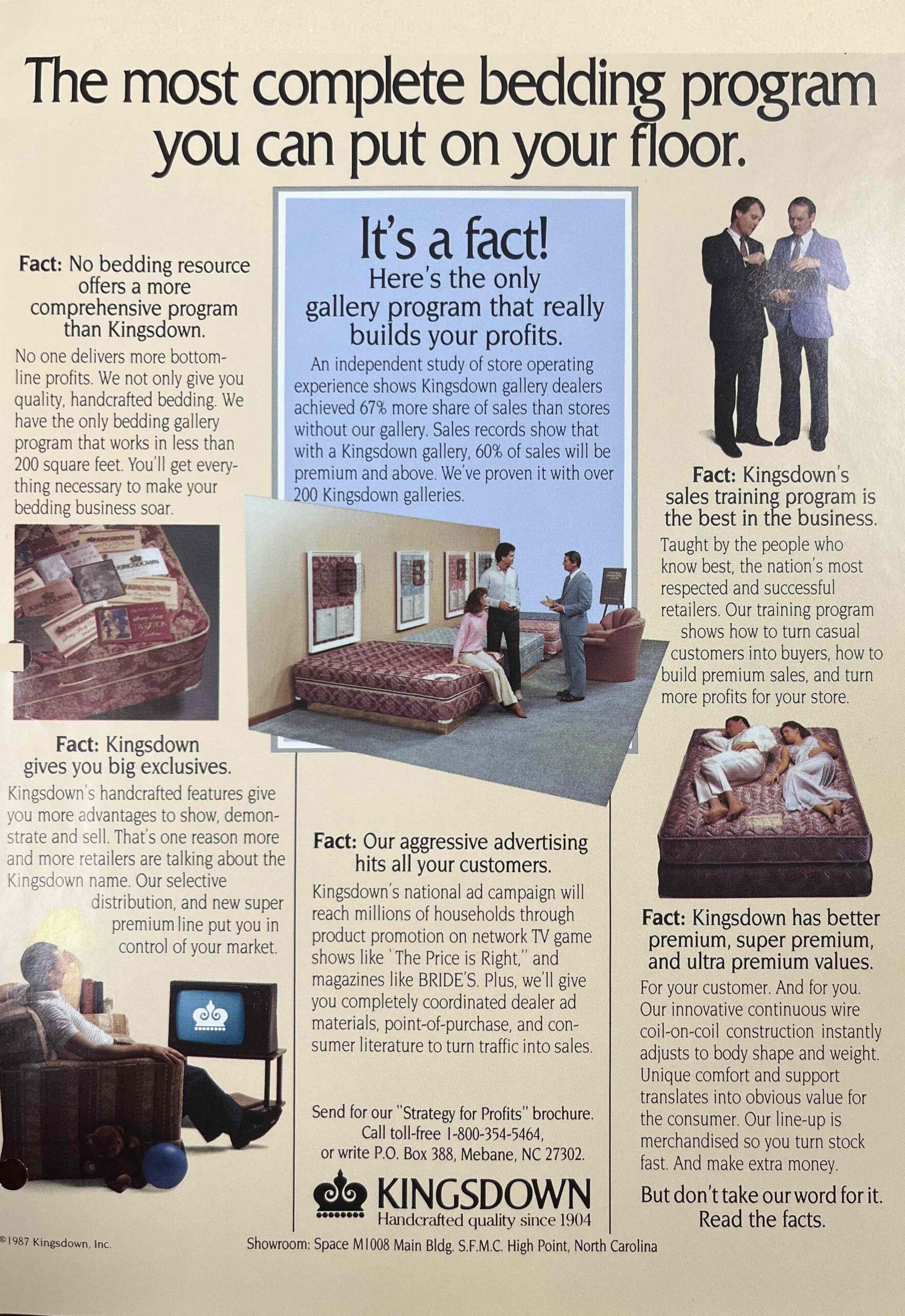 The company officially changes its name to Kingsdown, and sells its first international account. To ensure the highest quality mattresses, scientific analysis and durability testing are incorporated into the manufacturing process.